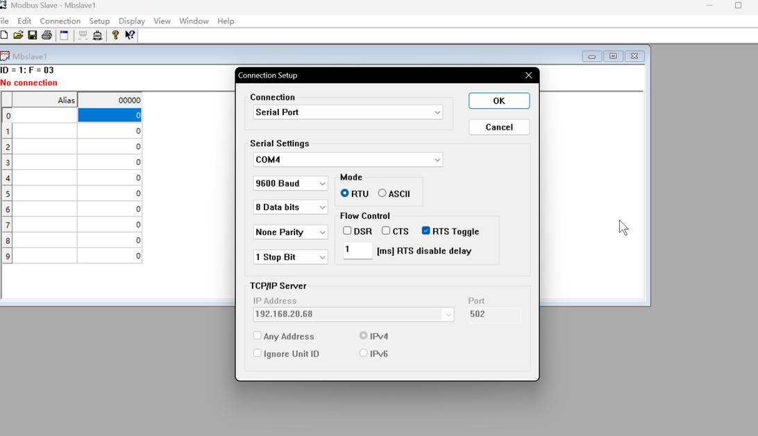 此時(shí) MBSlave 已作為地址為 1 的 Modbus RTU 從站運(yùn)行在 PC 上。