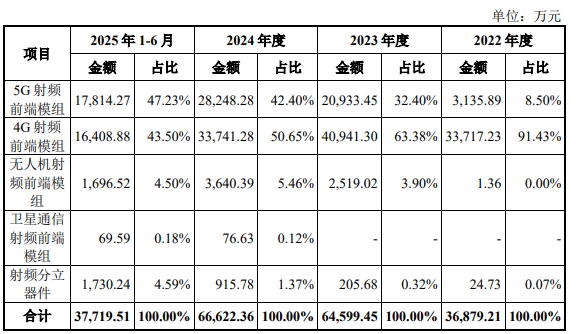 報(bào)告期內(nèi),公司主營(yíng)業(yè)務(wù)收入結(jié)構(gòu)顯示,2025年1-6月,5G射頻前端模組占比47.23%、4G射頻前端模組占比43.50%,無人機(jī)射頻前端模組占比4.50%,衛(wèi)星通信射頻前端模組占比0.18%,射頻分立器件占比4.59%。
