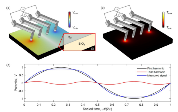 M4PP在多層系統(tǒng)上的示意圖。導(dǎo)電釕薄膜沉積在SiO?上,以Si為襯底。圖中展示了施加恒定電流時(shí)的(a)電勢(shì)分布和(b)溫度分布,以及(c)模擬的電壓波形