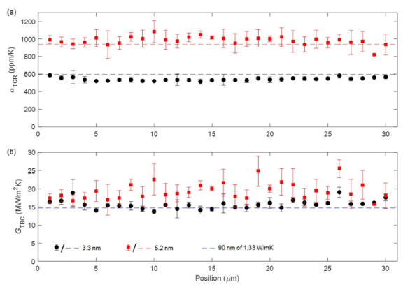釕薄膜的(a)電阻溫度系數(shù)和(b)釕與Si襯底間的總熱邊界電導(dǎo)及其擬合誤差。虛線(xiàn)分別表示PPMS參考值和90 nm SiO?的本征熱導(dǎo)值