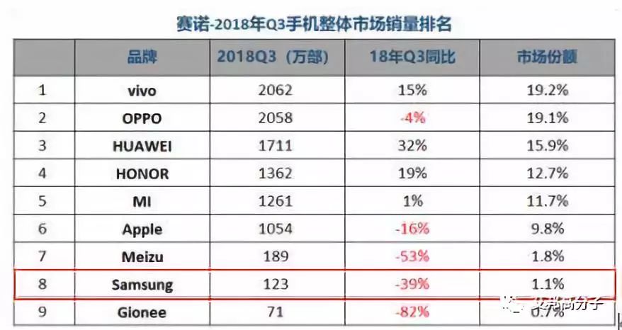 三星曾以機海戰(zhàn)術(shù)獲得了成功,覆蓋了從200元到上萬元的廣闊產(chǎn)品線,讓其在全球市場占據(jù)重要地位。而后,在市場激烈的競爭中,三星開始大規(guī)模削減機型。隨著國產(chǎn)品牌華為、OPPO、vivo、小米的崛起和三星在中端市場布局削減的共同作用,使其銷量有一定下滑。根據(jù)賽諾發(fā)布的2018年三季度手機整體市場銷量排名顯示,三星在中國市場排名第九。雖然市場份額下滑到1.1%,但排名仍上升。