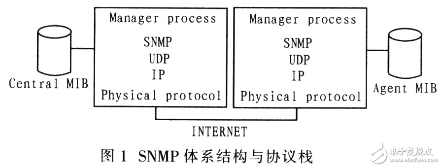 圖1為SNMP體系結(jié)構(gòu)與協(xié)議棧。