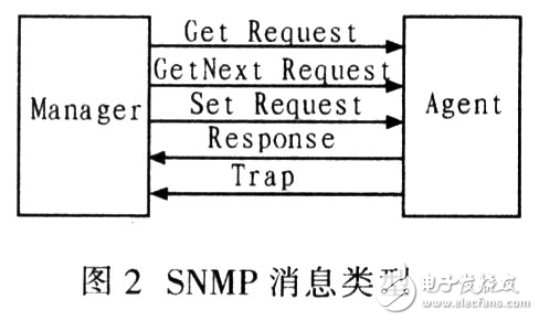 SNMP消息類型提供請求與響應(yīng)的交互形式,其中:(1)Get Request:管理站用來檢索代理管理信息庫中的標(biāo)量對象值;(2)GetNext Request:管理站用來檢索代理管理信息庫中的當(dāng)前標(biāo)量對象的下一個對象值;(3)Set Request:管理站用來設(shè)置代理管理信息庫中的標(biāo)量對象值;(4)Response:代理用于發(fā)送管理站對代理的請求;(5)Tmp:代理用于向管理站報告管理對象的狀態(tài)變化。圖2為SNMP消息類型。