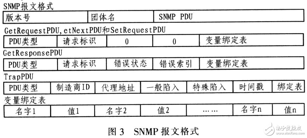圖3為SNMP報文格式。SNMP PDU協(xié)議數(shù)據(jù)單元結(jié)構(gòu)描述如下: