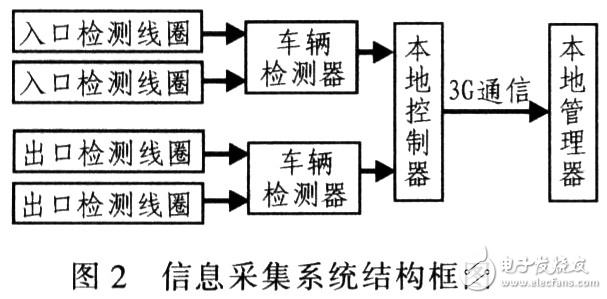 設(shè)計(jì)停車場(chǎng)采集系統(tǒng)時(shí),既要考慮能收集到準(zhǔn)確的停車場(chǎng)車位信息,又要最大限度利用現(xiàn)有設(shè)備,減少投入成本。信息采集系統(tǒng)包括車輛檢測(cè)線圈、車輛檢測(cè)器、本地管理器、電源系統(tǒng)、本地系統(tǒng)控制器。圖2為信息采集系統(tǒng)結(jié)構(gòu)框圖。