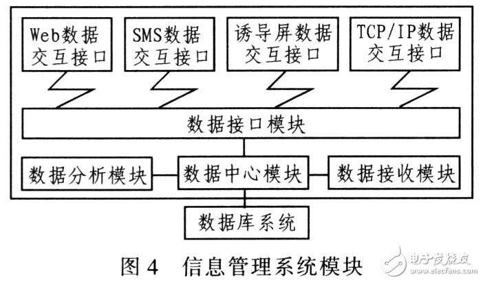 信息管理系統(tǒng)作為停車誘導(dǎo)信息系統(tǒng)的核心,軟件采用模塊化結(jié)構(gòu)設(shè)計(jì),提供網(wǎng)址顯示、GSM消息回復(fù)、LED誘導(dǎo)屏信息實(shí)時(shí)更新等接口,具備較強(qiáng)的擴(kuò)展性和移植性。信息管理系統(tǒng)模塊如圖4所示。