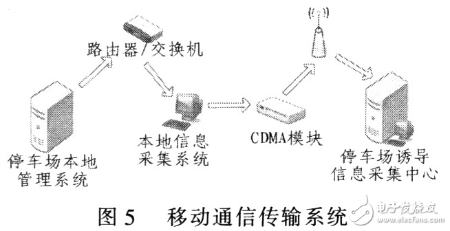 對(duì)于已實(shí)現(xiàn)車輛信息采集的停車場(chǎng),在配備車輛數(shù)據(jù)采集模塊同時(shí),可配置車輛數(shù)據(jù)傳輸模塊,通過(guò)串口發(fā)送至停車場(chǎng)的信息管理系統(tǒng),再由移動(dòng)通信模塊傳送至該城市的停車場(chǎng)誘導(dǎo)數(shù)據(jù)采集中心。圖5為移動(dòng)通信傳輸系統(tǒng)。