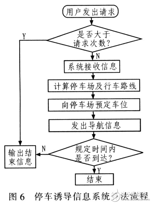 該系統(tǒng)中的另一個(gè)核心是誘導(dǎo)系統(tǒng)的處理算法。系統(tǒng)根據(jù)用戶的請(qǐng)求信息、車載定位系統(tǒng)和GIS-T得到車輛位置信息及停車場(chǎng)的動(dòng)態(tài)車位信息,綜合計(jì)算出最佳誘導(dǎo)路線。圖6為停車誘導(dǎo)信息系統(tǒng)算法流程。