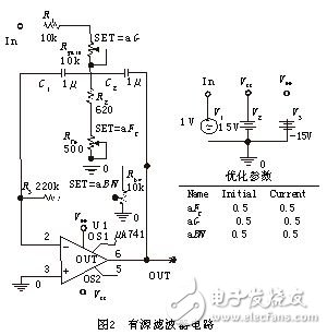 濾波器電路如圖2所示。優(yōu)化目標(biāo)要求中心頻率(Fc)為10Hz;3dB帶寬(BW)為1Hz,容差為10%;增益(G)為10,容差為10%。