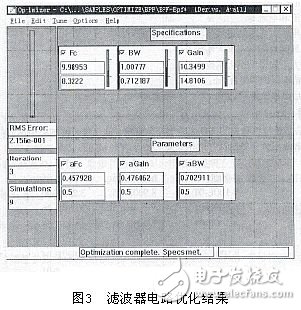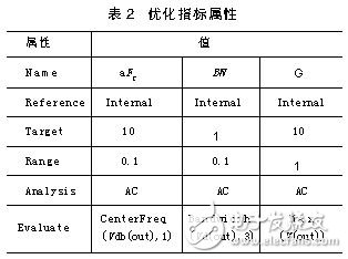 設(shè)置好待調(diào)整的元器件參數(shù)以后,調(diào)用Pspice Optimizer模塊并在優(yōu)化窗口中設(shè)置增益(G)、中心頻率(Fc)和帶寬(BW)三個(gè)優(yōu)化指標(biāo)。并利用Pspice中提供的特征值函數(shù)定義這三個(gè)優(yōu)化指標(biāo)。