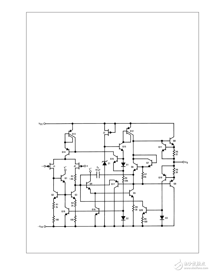 運(yùn)算放大器的差分輸入級。用FET作輸入級,不僅輸入阻抗高,輸入偏置電流低,而且具有高速、寬帶和低噪聲等優(yōu)點,但輸入失調(diào)電壓較大。常見的集成器件有LF355、LF347(運(yùn)放)及更高輸入阻抗的CA3130