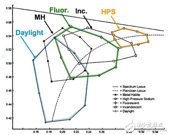 圖2:光源的色域面積指數(shù)是從通過連接在兩維空間中用于計算的CRI的顏色點形成的有界區(qū)域來計算。 (照明研究中心的禮貌倫斯勒理工學(xué)院)