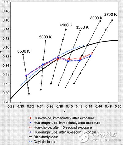 LRC得出的結(jié)論是一個光源80和100之間提供的80的最小的CRI和一蓋將提供良好的顏色鑒別,并在場景中的對象出現(xiàn)既生動自然提供足夠的照明提供給視覺場景。換句話說,消費者更喜歡能夠增強顏色不失真或使物體看起來不自然的光源。有趣的是,研究還表明,芯片制造商的野心,生產(chǎn)LED燈的黑體軌跡發(fā)光可能需要修改。在測試中參加者被六潔凈煤范圍從2700至6500 K在每個CCT示出的光,測試人員提出來判斷光的質(zhì)量在七個不同的色度值隨著測距上述值的垂直CCT線和下面的黑 - 身體軌跡。只有大約4100?做了參與者認(rèn)為高品質(zhì)白光與黑體軌跡相吻合。在“冷”(高)有條件現(xiàn)金轉(zhuǎn)移支付,與會者傾向于色度略高于軌跡;在“暖”(低級)CCTS優(yōu)選色度顯著下面的軌跡的測試儀(圖3)。在2700 K,例如,在黑體軌跡和“優(yōu)選的”白色光之間的感知而言差異等于13-15階麥克亞當(dāng)橢圓。