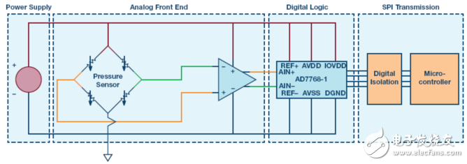 AD7768-1是ADI公司功能安全產品組合中的Σ-Δ ADC之一,具有廣泛的診斷特性,能賦予用戶誤碼檢測和診斷以及其他能力。圖2突出顯示了典型壓力檢測系統(tǒng)中的部分可能故障源。