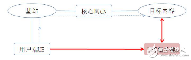 MEC系統(tǒng)原理如下圖所示,每個(gè)用戶終端(UE)發(fā)起內(nèi)容調(diào)用申請時(shí),傳統(tǒng)的內(nèi)容獲取需要經(jīng)過基站接入后,通過核心網(wǎng)(CN)連接目標(biāo)內(nèi)容,再逐層進(jìn)行傳遞完成終端和該目標(biāo)內(nèi)容間的交互,同一個(gè)基站下的其他終端如要發(fā)起同樣的內(nèi)容調(diào)用,上述調(diào)用流程和連接將重復(fù)發(fā)送,這樣,一方面占用了路徑上的各級網(wǎng)絡(luò)資源,另一方面也增加了相應(yīng)的時(shí)延。