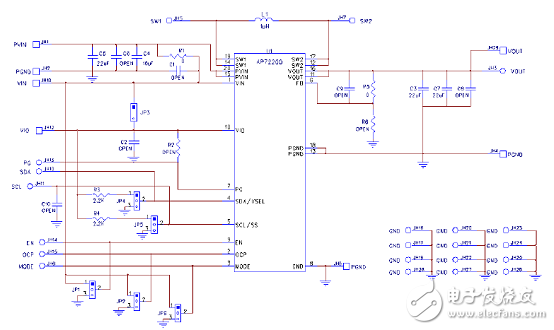 Diodes公司的AP72200是大電流同步DC/DC升降壓轉(zhuǎn)換器,具有高效率,極好的瞬態(tài)響應(yīng)和大DC輸出精度.它采用四開關(guān)H橋配置,支持降壓和升壓工作,升/降壓提供大于2A的輸出電流.AP72200具有I2C兼容兩線串行接口,包括雙向串行數(shù)據(jù)線,SDA和串行時(shí)鐘線,SCL.支持SCL時(shí)鐘速率高達(dá)3.4MHz;此外,還具有UVLO,OTP和OCP保護(hù)電路.輸入電壓VIN從2.3V到5.5V,輸出電壓從2.6V-5.14V,連續(xù)輸出電流2A,當(dāng)VOUT=3.4V和 VIN>2.9V時(shí)效率高達(dá)97%.主要用在智能手機(jī),平板電腦和其它手持設(shè)備.本文介紹了AP72200主要特性,功能框圖,典型應(yīng)用以及評(píng)估板AP72200-EVM主要特性,電路圖,材料清單和PCB設(shè)計(jì)圖.
