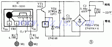 圖5是一個(gè)采用一音樂門鈴芯片KD-9300制作而成的觸摸開關(guān),電路新穎有趣。它巧妙地利用門鈴芯片內(nèi)部電路的功能,借助人體的泄漏電流去控制芯片內(nèi)部的雙穩(wěn)態(tài)觸發(fā)器。我們知道音樂集成電路具有極高的輸入阻抗,當(dāng)人手觸碰“開”電極片M1時(shí),人體的泄漏電流由R1注人音樂門鈴芯片的觸發(fā)端TR1,使芯片內(nèi)部雙穩(wěn)態(tài)觸發(fā)器翻轉(zhuǎn),以使整個(gè)門鈴芯片呈現(xiàn)低電阻,三極管VT1導(dǎo)通,繼電器K吸合,常開接點(diǎn)可接通被控電器。需要關(guān)閉電器時(shí),只要觸摸一下“關(guān)” 電極片M2,人體泄漏電流經(jīng)R2注人芯片的Vss端,迫使集成塊內(nèi)部的雙穩(wěn)態(tài)觸發(fā)器再次翻轉(zhuǎn),使整個(gè)芯片是現(xiàn)高電阻,VT進(jìn)人截止態(tài),K失電釋放,被控電器斷電。