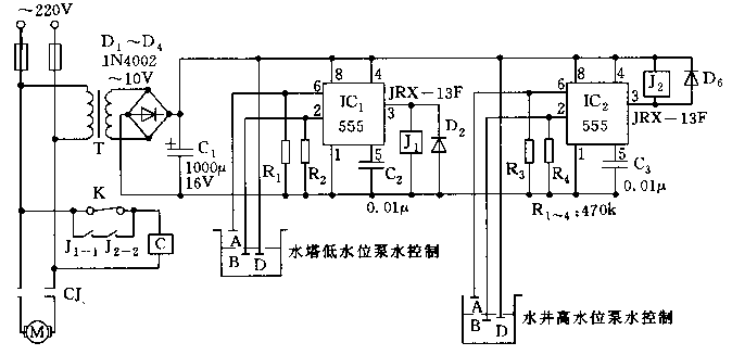 如圖所示,控制電路由降壓整流電路和用兩塊555組成的低水位泵水、高水位泵水兩種控制電路組成。當(dāng)水塔內(nèi)的水位探極B、D高于塔內(nèi)水位線時,Ic1的2腳為“地”電位,輸出3腳呈高電平,使繼電器j1吸合,J1-L閉,抽水電機運轉(zhuǎn);當(dāng)水位上他升到探級A時,電機停止,對水塔水位實現(xiàn)自動控制。置放于水井中的探極B、D,正常情況下應(yīng)在水位面以下一定深度處,使Ic2(555)電路的輸出端3腳呈低電平,J2吸合,j2-2閉合。而當(dāng)因連續(xù)抽水,使B、D極高出水面時,則2腳呈地電位,使Ic2翻轉(zhuǎn)置位,3腳呈高電平,J2釋放,J2-2斷開,避免電機空轉(zhuǎn),并對井水水位進行監(jiān)測.