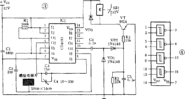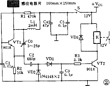 電容式接近控制器通常由一個射頻振蕩電路和一個探測板組成。圖2是用分立元件制作的電容傳感