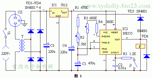 該裝置的電路工作原理見圖1(點(diǎn)此下載原理圖)。它采用了一塊時(shí)基集成電路NE555作循環(huán)定時(shí)控制器。當(dāng)電源接通時(shí),由于IC1的②、⑥腳為低電平,則IC1觸發(fā)置位,其③腳變?yōu)楦唠娖?,此時(shí)繼電器J勵(lì)磁吸合,它的常閉觸點(diǎn)j1斷開,R5不起作用。與此同時(shí),常開觸點(diǎn)j2閉合,電冰箱得電開始工作制冷。此時(shí)由于IC1的③腳處于高電平狀態(tài),二極管VD6導(dǎo)通,電流經(jīng)過(guò)電阻R1、R2向C1充電,隨著時(shí)間的推移,C1兩端的電壓升至2/3電源電壓時(shí),IC1自動(dòng)復(fù)位,其③腳變?yōu)榈碗娖?,?duì)應(yīng)的繼電器J也失電釋放,電冰箱停止工作。停止工作后,由于IC1的③腳為低電平,此時(shí)j1接通了R5,由于R5的接入,使得IC1的閾值電壓不是1/3電源電壓,而是IC1⑤腳電壓的1/2。此時(shí)C1經(jīng)R3、R4和IC1內(nèi)部放電管放電,一直放到C1上的電壓降至1V左右時(shí),IC1又重新翻轉(zhuǎn)置位,即IC1的③腳又轉(zhuǎn)為高電平。所以,由于R5的接入能使較小的R3、R4阻值獲得較長(zhǎng)的延時(shí),同時(shí)也可減小第一次和以后各次的充電時(shí)間差。按照該原理圖的取值,適當(dāng)調(diào)節(jié)R2、R3,可以使電冰箱的開機(jī)和關(guān)機(jī)時(shí)間各自控制在5-15分鐘左右變化,為了延長(zhǎng)電冰箱的關(guān)機(jī)時(shí)間,還可適當(dāng)降低R5的阻值。