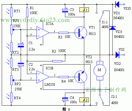 4059 現有的太陽能自動跟蹤控制器無外乎兩種:一是使用一只光敏傳感器與施密特觸發(fā)器或單穩(wěn)態(tài)觸發(fā)器,構成光控施密特觸發(fā)器或光控單穩(wěn)態(tài)觸發(fā)器來控制電機的停、轉;二是使用兩只光敏傳感器與兩只比較器分別構成兩個光