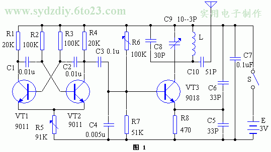 該裝置是由發(fā)射機和接收機兩部分組成的系統(tǒng),工作于調(diào)頻(FM)波段。發(fā)射機的電路工作原理見圖1(點擊下載原理圖)。它是由三極管VT1、VT2及其外圍元件構(gòu)成的多諧振蕩器,其工作頻率約為1000Hz,其信號通過電容器C3取出去調(diào)制由VT3及其LC元件構(gòu)成的調(diào)頻振蕩器,被調(diào)制的調(diào)頻信號從C10輸出,通過機內(nèi)微型天線向空間輻射。其中C6的作用是加寬頻帶并能有效防止人體感應對頻率的影響。
