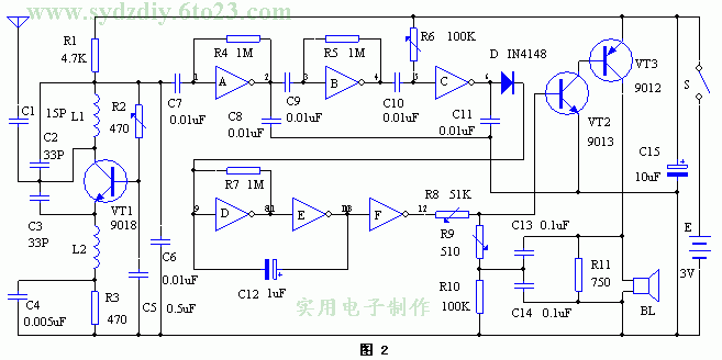接收機的電路工作原理見圖2(點擊下載原理圖)。由三極管VT1及其LC元件等組成超再生接收電路,用來接收發(fā)射機發(fā)出的調(diào)頻信號。門電路A、B、C構(gòu)成信號放大電路,將接收到的信號放大、比較、倒相去控制門電路D、E組成的1Hz振蕩電路,再由門電路F倒相輸出去控制由三極管VT2、VT3組成的互補音頻振蕩器。