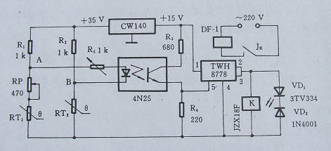 液位自動控制電路圖:控制器的水位控測器,觸發(fā)控制器和降壓整流電路組成。