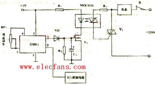 下圖是自動(dòng)門控制電路原理圖。人體移動(dòng)探測(cè)采用新型熱釋電紅外線探測(cè)模塊HN911。V1用作延時(shí)控制,通過調(diào)節(jié)電位器RP1便可改變延時(shí)控制的時(shí)間。光耦MOC3020起交直流隔離作用。當(dāng)無人行走需通過自動(dòng)門時(shí),HN911輸出端為低電平,V1無控制信號(hào)輸出,雙向晶閘管V2關(guān)閉,負(fù)載電機(jī)不工作,門處于關(guān)閉狀態(tài)。當(dāng)有人接近自動(dòng)門時(shí),HN911模塊檢知到人體紅外能量,輸出端I為高電平輸出,雙向晶閘管導(dǎo)通,負(fù)載電機(jī)工作,打開自動(dòng)門。當(dāng)自動(dòng)門運(yùn)行到位時(shí),由限位開關(guān)S切斷電源。由于HN911模塊輸出端2輸出的電平正好和輸出端1的電平相反,故可用輸出端2的輸出控制自動(dòng)門關(guān)閉。