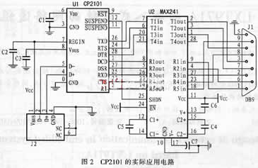 CP2101的實(shí)際應(yīng)用參考電路如圖2所示。該電路經(jīng)過制板和調(diào)試,證明是完全可行的。