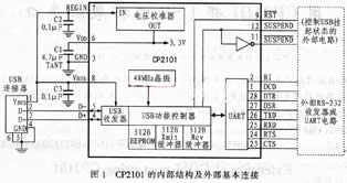 CP2101的內(nèi)部結(jié)構(gòu)及外部基本連接電路如圖1所示。由圖1可見,用CP2101進(jìn)行串口擴(kuò)展所需的外部器件非常少,僅需3只去耦電容器即可,使用起來非常方便。