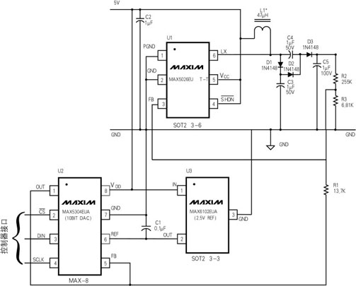 5105 DS1842應(yīng)用電路(76V、APD偏置輸出電路,帶有電流監(jiān)測)