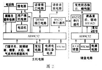 (2)以單片機(jī)為核心構(gòu)成的雙CPU系統(tǒng),一個(gè)以完成用戶鍵盤輸入、漢字液晶顯示、故障狀態(tài)指示為主,另一個(gè)完成報(bào)警檢測(cè),若有報(bào)警事故發(fā)生,將所監(jiān)測(cè)的報(bào)警信號(hào)進(jìn)行分類處理,并且可向外界發(fā)出聲光報(bào)警信號(hào),也可以調(diào)出已存貯好的相應(yīng)語音信號(hào),通過電話網(wǎng)絡(luò)向外發(fā)出警情信號(hào)。