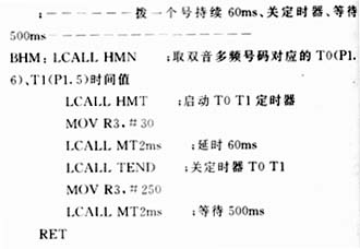 (3)在警情服務(wù)子程序中,包括調(diào)用DTMF撥號(hào)子程序。由定時(shí)器T0控制在P1.6產(chǎn)生一個(gè)低頻方波信號(hào),由定時(shí)器T1控制在P1.5產(chǎn)生一個(gè)高頻方波信號(hào),經(jīng)合成后產(chǎn)生DTMF雙音多頻信號(hào),參考程序如下: