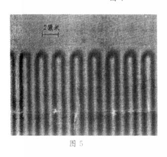 前文已經(jīng)講到,由于濕法腐蝕的各向同性,總存在一定的側(cè)向腐蝕量,使條寬難以控制,在亞微米工藝中很少被采用。但是如果能巧妙利用這個側(cè)向腐蝕寬度的話(一般與待腐金屬膜厚成一定比例),再結(jié)合剝離工藝,同樣可制作出精細的圖形結(jié)構(gòu)。圖4描述了這樣的制作過程。叉指換能器分兩次沉積,每次一半,第二次沉積的電極均勻地插入濕法腐蝕后形成的電極中間,電極間隙由側(cè)向腐蝕寬度決定。此方法通過一次曝光兩次成型,成功地使叉指密度提高了一倍。我們采用KARLSUSS光刻機,接觸式曝光,以叉指倍頻技術(shù)成功制得1.8GHz諧振器、2.2GHz濾波器,圖5就是2.2GHz藍牙通訊用濾波器的電極照片(一部分),其叉指寬度約為0.5微米。