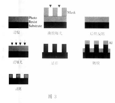 基片上僅留下與光刻版圖形完全相反的圖案,然后再在基片上鍍上一層厚度符合要求的金屬層,再把基片放入剝離液,在超聲波的作用下剝?nèi)ス饪棠z以及上面的金屬層,只留下與光刻版完全相同的電極圖案。圖3描述了這樣的工藝過程。