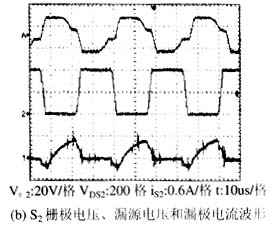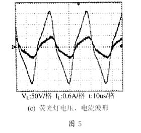 ??? 在實(shí)際電路中,用圖3中的電容C1、C2串聯(lián)取代圖2中的電容CB。圖5給出了相關(guān)的實(shí)驗(yàn)波形。圖5a是交流輸入電壓、電流波形,可見輸入電流接近正弦。圖5b是開關(guān)S2的柵極電壓、漏源電壓和漏極電流波形,明顯可見,關(guān)斷時(shí)漏極電壓緩慢上升,為零電壓關(guān)斷,開通時(shí),漏極電壓先降到零,然后觸發(fā)其開通,為零電壓開通。因此開關(guān)損耗較小。圖5c是熒光燈兩端電壓和流過(guò)熒光燈的電流波形。整個(gè)電路的功率因數(shù)為0.98,總諧波畸變率為8%,效率達(dá)到85%。