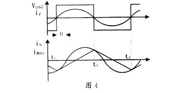 圖4給出了簡(jiǎn)化后的等效電路和關(guān)鍵波形。電流互感器用一個(gè)電流控制電流源并聯(lián)一個(gè)激磁電感Lm等效。一個(gè)理想變壓器的兩個(gè)繞組分別與S1、S2的柵極相連。假設(shè)在t0時(shí)刻,S1關(guān)斷,S2開通,反饋電流is大于激磁電流imag,因此,流過(guò)齊納二極管的電流iz為正,在理想的齊納二極管兩端產(chǎn)生正的電壓施加在S2的柵極,而施加在S1的柵極電壓為負(fù),S2保持導(dǎo)通,S1保持關(guān)斷。同時(shí),激磁電感承受正的電壓,激磁電流線性增加,而反饋電流is隨著諧振電流ip的變化而變化,到t1時(shí)刻,激磁電流ima超過(guò)反饋電流is,iz變負(fù),齊納二極管兩端電壓變負(fù),因此S2關(guān)斷,S1開通,下半個(gè)開關(guān)周期開始。這樣可以保證電路持續(xù)振蕩工作。由圖4可知,逆變輸出電壓超前于諧振電流,這樣在電容C3、C4的作用下,可以使S1和S2工作于零電壓開關(guān)狀態(tài),以減小開關(guān)損耗和電磁干擾。