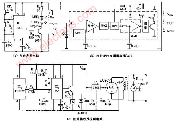 紅外線遙控電路圖:由常規(guī)集成電路組成的單通道紅外遙控電路。這種遙控電路不需要使用較貴的專用編譯碼器,因此成本較低?! 瓮ǖ?b style="color: red">紅外遙控發(fā)射電路