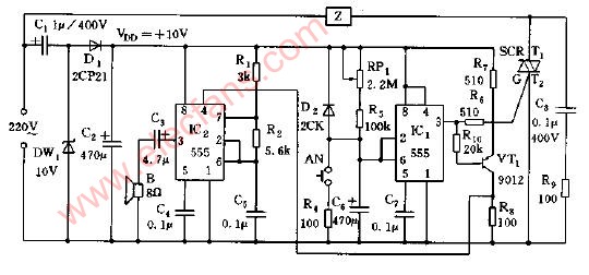 限時(shí)講話聲光報(bào)訊器電路圖:電路由降壓整流,定時(shí),訊響及可控硅控制等電路組成。用于限制發(fā)言時(shí)間的場(chǎng)合。