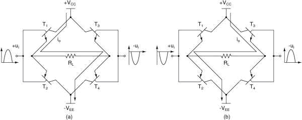 OTL電路采用單電源即可工作,所以在便攜式功放中很常用,如果不加輸出電容,則穩(wěn)態(tài)時輸出電壓為0.5Vcc,所以輸出電容不可省去。但是輸出電容也影響了電路的低頻響應(yīng)。為了提高低頻響應(yīng),OCL電路使用對稱雙電源供電,使穩(wěn)態(tài)輸出為0V,省去輸出電容。這時,加在負(fù)載上的最大電壓為Vcc。這樣電源電壓利用率偏低,因為整個電源電壓為2Vcc。提高利用率的方式是使用BTL電路,負(fù)載接在電橋中,兩端的最大電壓可達(dá)2Vcc,相同供電電壓下輸出功率是OCL的四倍,但是元件數(shù)量翻倍。下圖示出了BTL電路的原理。每次都是電橋?qū)?cè)橋臂上的管子同時導(dǎo)通和截止。由于負(fù)載中點電壓始終在0V,我們可以把BTL電路看成是兩個等效負(fù)載為0.5RL的OCL電路。