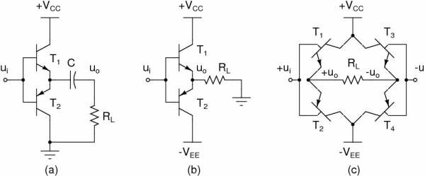 我們還是先介紹一些功放后級電路的基礎(chǔ)。事實上,功放前級關(guān)心的是增益,后級關(guān)心的則是帶負(fù)載能力。通常的揚聲器阻抗都是8歐,若要產(chǎn)生10W的輸出,后級的電流輸出能力就必須大于1A。就這一點,集成運算放大器就不能勝任。所以必須加接電流放大級。這些電流放大級的電壓增益甚至不到1,一般都是使用射級跟隨器。功放后級的輸出方式后變壓器輸出、OTL(Output TransformerLess,無輸出變壓器,下圖(a))、OCL(OutputCapacitorLess,無輸出電容,下圖(b))、BTL(BridgedTransformerLess,橋式,下圖(c))等幾種。變壓器輸出一般用于電子管后級很少用于晶體管電路,后三種在晶體管和集成電路后級中廣泛采用。