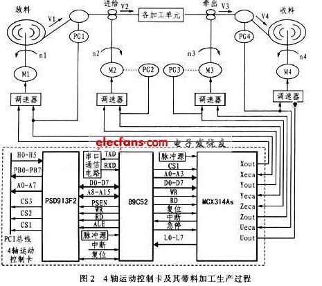 4軸運(yùn)動(dòng)控制卡以MCX314As為核心,采用89C52型單片機(jī)作為主控制器,并采用PSD913F2型可編程外圍器件來(lái)替代傳統(tǒng)的大部分外圍器件,MCX341As的時(shí)鐘頻率由外部決定,本系統(tǒng)采用了MCX314As默認(rèn)的16MHz頻率作為時(shí)鐘信號(hào),圖2中,PG1、PG2、PG3、PG4為光電編碼器,M1、M2、