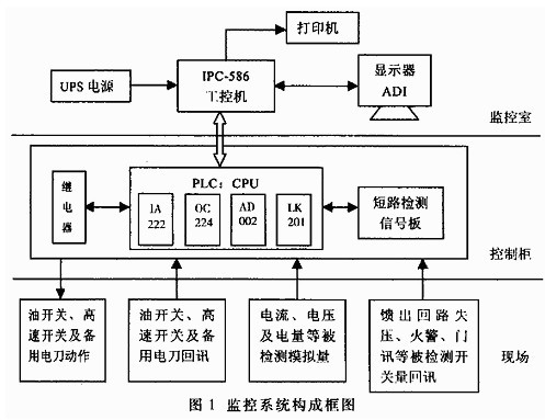 圖1中,控制室屬于上位機(jī)監(jiān)控部分。主機(jī)選用***研華公司生產(chǎn)的IPC-586工控機(jī)。采用WINDOWS95NT、VC++5.0畫面開(kāi)發(fā)軟件。通過(guò)上位機(jī)畫面可以對(duì)站內(nèi)運(yùn)行狀態(tài)進(jìn)行監(jiān)視。當(dāng)站內(nèi)運(yùn)行情況發(fā)生異常時(shí),可進(jìn)行越限或故障的聲音報(bào)警及文字提示,同時(shí)自動(dòng)彈出有關(guān)畫面,便于監(jiān)護(hù)人員迅速分析、處理,以最短的時(shí)間恢復(fù)供電。其報(bào)警內(nèi)容包括:母排失壓或超低限的報(bào)警;送出回路失壓、故障跳閘、短路或末端短路的報(bào)警;油開(kāi)關(guān)跳閘的報(bào)警;在早6:30~晚21:00之間,對(duì)饋出回路電流I<30A、時(shí)間T≥15min的超低限報(bào)警;某饋出回路I≥1500A、時(shí)間T持續(xù)達(dá)5秒時(shí)間的超大電流報(bào)警;火災(zāi)、防盜門訊的報(bào)警等。此外,該系統(tǒng)還可對(duì)各控制開(kāi)關(guān)執(zhí)行合、跳閘命令時(shí)不到位故障進(jìn)行報(bào)警提示。各類報(bào)警按其緊急程度分別以四種聲音來(lái)提示。