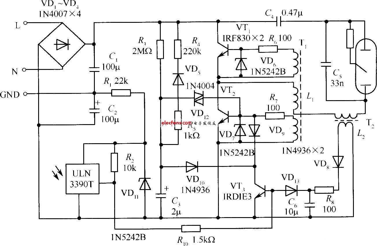 175W汞蒸氣燈自動(dòng)開/關(guān)的電子鎮(zhèn)流器電路圖如下: