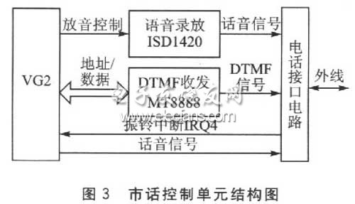 市話控制單元利用住宅電話資源,串接在外線和用戶的普通電話機(jī)中間,平時不影響電話正常使用。它由外圍摘掛機(jī)控制電路、振鈴檢測電路、DTMF收發(fā)電路、語音錄放電路等構(gòu)成。