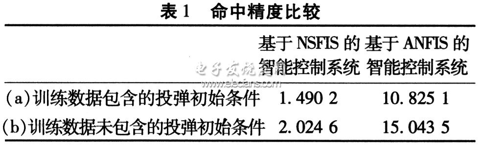 用含有擾動(dòng)誤差的訓(xùn)練數(shù)據(jù),對(duì)基于ANFIS的制導(dǎo)炸彈智能控制系統(tǒng)和基于NSFIS的制導(dǎo)炸彈智能控制系統(tǒng)分別進(jìn)行訓(xùn)練,并分別在(a)和(b)條件下進(jìn)行投彈控制試驗(yàn)。設(shè)得到兩種智能控制系統(tǒng)的控制結(jié)果比較如表1所示(表中數(shù)據(jù)為CEP,單位:m)。