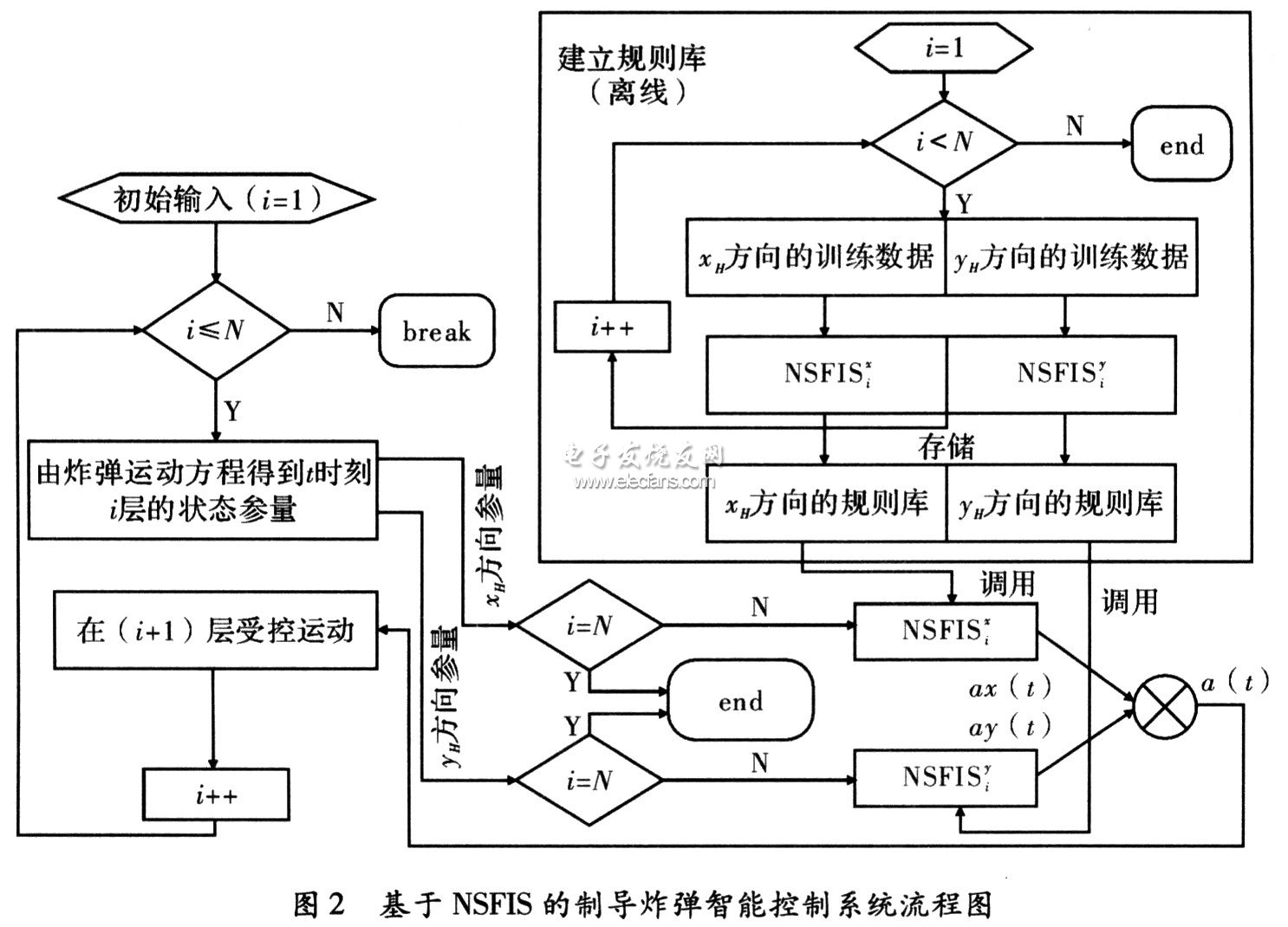 根據(jù)彈道運(yùn)動(dòng)方程,x與y方向的控制相互獨(dú)立(a(t)=ax(t)+ay(t)),所以對(duì)空間每一層建立兩個(gè)非單點(diǎn)模糊子系統(tǒng)(NSFISix和NSFISiy):NSFISix調(diào)控導(dǎo)彈在x方向的運(yùn)動(dòng)軌跡,輸入為Exh(t)、Axe(t)、Vxh(t),輸出為ax(t);NSFISiy調(diào)控導(dǎo)彈在y方向的運(yùn)動(dòng)軌跡,輸入為Eyh(t)、Aye(t)、Vyh(t),輸出為ay(t)。充分搜集每一層的訓(xùn)練數(shù)據(jù),利用文中提出的學(xué)習(xí)算法調(diào)整好NSFISix和NSFISiy的內(nèi)部參數(shù),就構(gòu)成了基于NSFIS的制導(dǎo)炸彈智能控制系統(tǒng),其概略流程圖,如圖2所示。