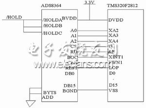 ??????? TMS320F2812芯片上有一個(gè)12位、轉(zhuǎn)換頻率為25MHz的ADC,其前端為兩個(gè)8選1的多路轉(zhuǎn)換器和兩路同時(shí)采樣/保持器。在要求不很高時(shí),完全可利用其構(gòu)成同步順序采樣電路,或者增加外部采樣保持器后構(gòu)成同步采樣。考慮到本系統(tǒng)對電量采集精度和速度的要求較高,采樣模塊中選用了外置的六通道16位ADC ADS8364。該器件內(nèi)部包括6個(gè)高速采樣-保持放大器、6個(gè)高速ADC、一個(gè)參考電壓源及3個(gè)參考電壓緩沖器,可以提供250KSPS的同步采樣率,還可提供具有超低功耗(69mW/每通道)的所有6個(gè)輸入通道的轉(zhuǎn)換,這樣使得所有通道的單位成本均較低。6個(gè)通道的數(shù)據(jù)輸出接口電壓介于2.7~5.5V,便于與DSP直接接口,省去了中間的電平轉(zhuǎn)換。6個(gè)完全獨(dú)立的ADC可大大提高硬件整體的并行處理速度,在50kHz輸入信號下仍可保證大于80dB的卓越共模抑制能力,特別適合用于高干擾環(huán)境。圖4為ADS8364與TMS320F2812的接口電路。