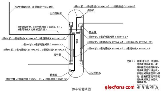停車場(chǎng)線管應(yīng)嚴(yán)格遵循強(qiáng)弱電分開(kāi)布管的原則。過(guò)路管應(yīng)采用鐵管,割地埋管的深度應(yīng)保證線管上部距地面大于30mm。系統(tǒng)有遠(yuǎn)距離線管時(shí)應(yīng)設(shè)計(jì)布線圖(如網(wǎng)絡(luò)線、出入口分開(kāi)時(shí)的線路),圖中應(yīng)標(biāo)明管路走向、線管材型號(hào)、敷設(shè)方式及敷設(shè)距離(詳見(jiàn)停車場(chǎng)管線圖)。